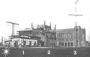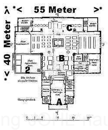 RECHTS: 2: Der integrierte Neubau von 1911. A: Die Vortragshalle. B: Die Maschinenhalle (40 mal 55 Meter in den größten Ausdehnungen. C: Der Spulenraum als Teil von B. |