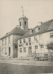 umfassten einen Grundriss von etwa 8 mal 15 Metern. Ein Nebeneingang (Publikumseingang?) war an der rechten Seite der dreiachsigen Front zur Markstraße eingebaut. Links davon hing das "Schwarze Brett", an dem amtliche Mitteilungen veröffentlicht wurden. Das Haus befand sich fast in der Mitte vom heutigen Durchbruch zur Marktstraße. Zwischen dem rechten Giebel und dem Nachbarhaus gab es einen schmalen Durchgang, der aber durch eine Tür verschlossen war. Zwischen dem linken Giebel und dem angrenzenden Geschäftshaus gab es einen öffentlichen Durchgang, der aber auch nicht sehr breit gewesen sein kann. |