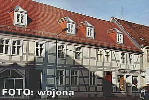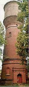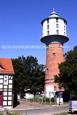 Backsteinen dar. Errichtet wurde er 1898, um durch den Eigendruck des Wassers die Haushalte der Stadt mit fließendem Wasser zu versorgen. Der Turmkopf wurde erst im Jahre 1978 verputzt, als man das erste Mal seit dem Bestehen des Turmes umfangreichere Sanierungen durchführte, da der Stahlkessel durchzurosten drohte. 2006: Nun ist es entschieden. Der Turm wurde privat restauriert und zu einem dreistöckigen Wohnhaus umgebaut, wobei man denkmalpflegerische Aspekte nicht ganz außer Acht gelassen hat. Im Linkerhand sichtbaren, ebenfalls denkmalsgerecht hergestellten, Fachwerkhaus befindet sich eine Galerie. Deren Inhaberin ist von der Nordküste in unsere gemütliche Stadt gezogen |