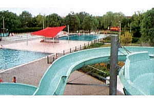 Karl-Thon-Platz (The Nauener outdoor swimming pool.)... erhielt, genau wie die angrenzende Straße seinen Namen zu DDR-Zeiten im Gedenken an den von SA-Schergen ermordeten Karl-Thon. Zur Gründungszeit 1926 nannte man in Gewoba-Baussen-Platz (Gewoba war die Abkürzung für den Eigentümer GEmeinützige WOhnungs-BAu-Genossenschaft und "Baussen" war ein hochangesehener Nauener Bürgermeister). Vom März 1933 bis Mai 1945 nannten ihn die Nazis "Göringplatz", nach dem Oberbefehlshaber der deutschen Luftwaffe, Herman Göring. |