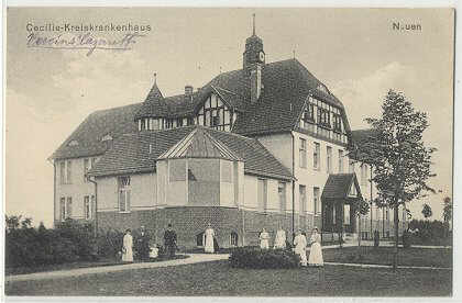 und Umbauten (RECHTS: Dunkler Komplex im Bild ganz rechts -z.B.: 1931: auf 170 Betten). Die neue Klinik (helles Gebäude-H) nahm am 1. Mai 1998 ihren regulären Betrieb auf. Der Bau war notwendig geworden, weil nach 1989 der Ort Staaken (heute Weststaaken, Bezirk Berlin-Spandau) wieder zum Land Berlin gehörte. Damit lag auf einmal der größere Teil des Kreiskrankenhauses des Landkreises Nauen auf Berliner Territorium. Durch Vereinbarungen war die Weiternutzung der Bauwerke erstmal gesichert, doch der Endtermin stand schon fest. Und so war Nauen der erste Ort in Brandenburg, der eine komplett neue Klinik erhielt. |