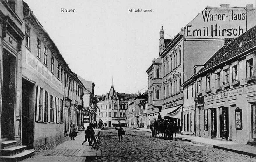 in den späteren Jahren entfernt oder übermalt worden. RECHTS: Dieses Haus in der Mittelstraße 33 wurde von der ehemaligen Familie Voss im Jugendstil erbaut. In den 1930ziger Jahren hat hier Otto Voss, der Sohn des Begründers, seine Verkäufe getätigt. Zu DDR-Zeiten nutzte die KONSUM-Genossenschaft Nauen, die ihren Sitz in der Hertefelder Str. 9 hatte, die Ladenzeile. Seit den 1990iger Jahren wird es wieder von einem genossenschaftlichen Einzelhandel genutzt. |