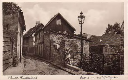 dem Abriss der Mauer teilweise auf deren Fundamenten errichtet. LINKS: Es ist gut zu erkennen, dass die rechten Häuser der Gasse auf dem Fundament der alten Stadtmauer stehen und sich dem ehemaligen Mauerhang nach rechts anpassen (s. Treppengeländer) |