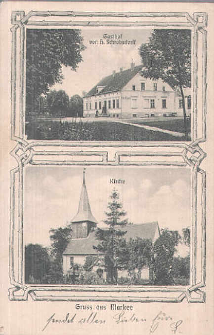 Kreisstadt Rathenow teilt. RECHTS: Oben der Gasthof von Schrobsdorff und unten die Markeer Kirche im Jahre 1911. |