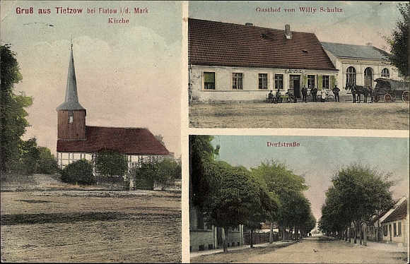 Kreisstadt Rathenow teilt. RECHTS: Kirche, Gasthof von Willy Schultz und Dorfstraße auf einer Ansichtskarte von 1901. |