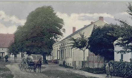 durch das Amt Nauen-Land, mit Sitz in der Stadt Nauen, vertreten. LINKS: Das ehemalige Gebäude des Amtes Nauen-Land in der Dammstraße von Nauen. RECHTS: Gasthof von Ernst Senss 1907 in Niebede. |